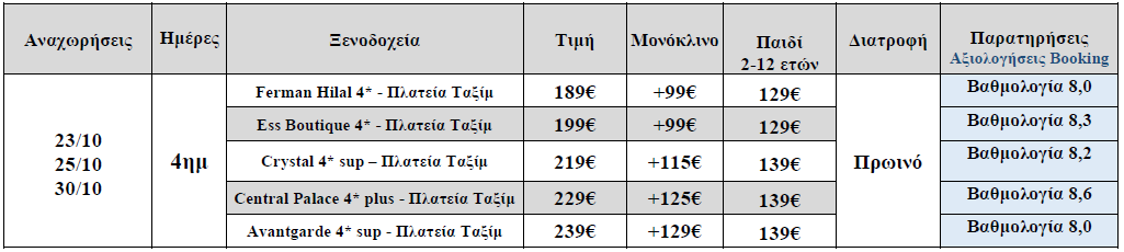 Μετά το πρωινό θα επισκεφθούμε το Αγίασμα της Παναγίας των Βλαχερνών όπου οι Βυζαντινοί έψαλλαν για πρώτη φορά το 626 μ.Χ τον Ακάθιστο Ύμνο για να ευχαριστήσουν την Θεοτόκο Στρατηγό που λύτρωσε την Πόλη, και σε ανάμνηση αυτού του θαύματος τον ψάλλουμε κάθε χρόνο σε όλους τους ορθόδοξους ναούς μέχρι σήμερα. Στην συνέχεια θα κατευθυνθούμε με το λεωφορείο μας στο ιστορικό κέντρο, όπου άλλοτε βρισκόταν ο Βυζαντινός Ιππόδρομος, περνώντας έξω από το Μπλέ Τζαμί κατευθυνόμαστε προς την Αγία Σοφία προκειμένου να επισκεφτούμε τον γυναικωνίτη της, με τα υπέροχα ψηφιδωτά του ,που πλέον λειτουργεί σαν τζαμί με όλους τους κανόνες που επιβάλλονται. Ακολουθεί η επίσκεψη μας στην Βασιλική Δεξαμενή του Ιουστινιανού με το πολύ ατμοσφαιρικό της περιβάλλον που αποτελεί ακόμη ένα θαύμα της βυζαντινής αρχιτεκτονικής. για να ανηφορίσουμε προς την σκεπαστή αγορά (kapalı çarşı) όπου θα έχουμε ελεύθερο χρόνος στα δαιδαλώδη στενά της για αγορές και παζάρια. Στον ελεύθερο χρόνο που θα έχετε στην Σκεπαστή Αγορά σας προτείνουμε να επισκεφθείτε και την Αιγυπτιακή Αγορά για αγορές μπαχαρικών και εδεσμάτων. Επιστροφή στο ξενοδοχείο, ξεκούραση και το βράδυ προαιρετική διασκέδαση σε νυχτερινό κέντρο με παραδοσιακούς χορούς oriental . Διανυκτέρευση.